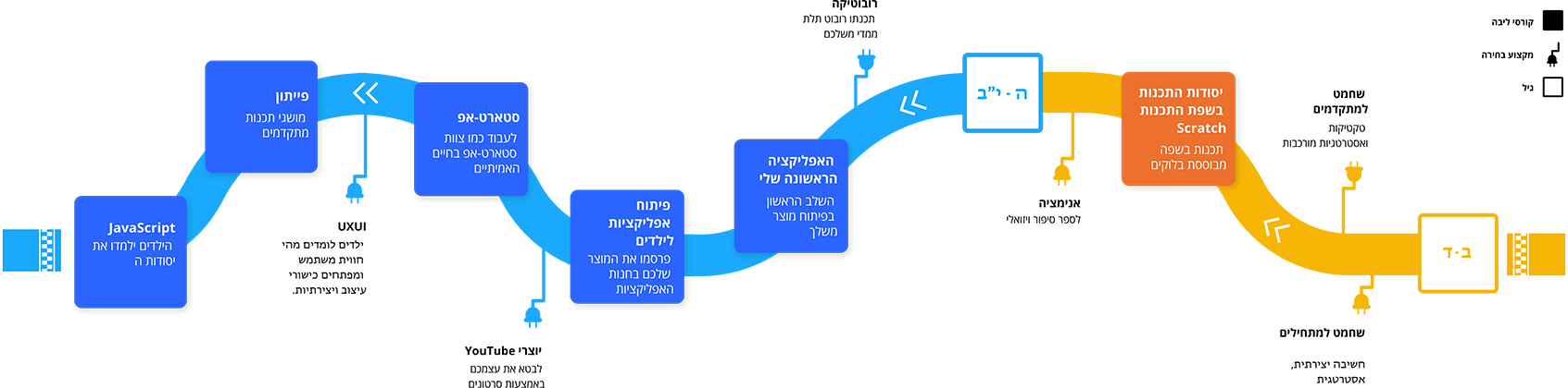 יש ילדים שרוצים קורס חד פעמי. אחרים רוצים לרכוש מגוון רחב של מיומנויות חדשות. לכן יצרנו תוכנית לימודים משלימה שבה הילדים שלכם יכולים לבחור את המסלול המועדף עליהם. ילדים יכולים להירשם בכל שלב וללמוד במשך שנה עד שש שנים.